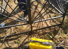 Предварительно убрав уже выросшие сорняки, мы привариваем к ножкам ограждения металлическую полосу. Она обозначает периметр участка и препятствует высыпанию крошки за его пределы.